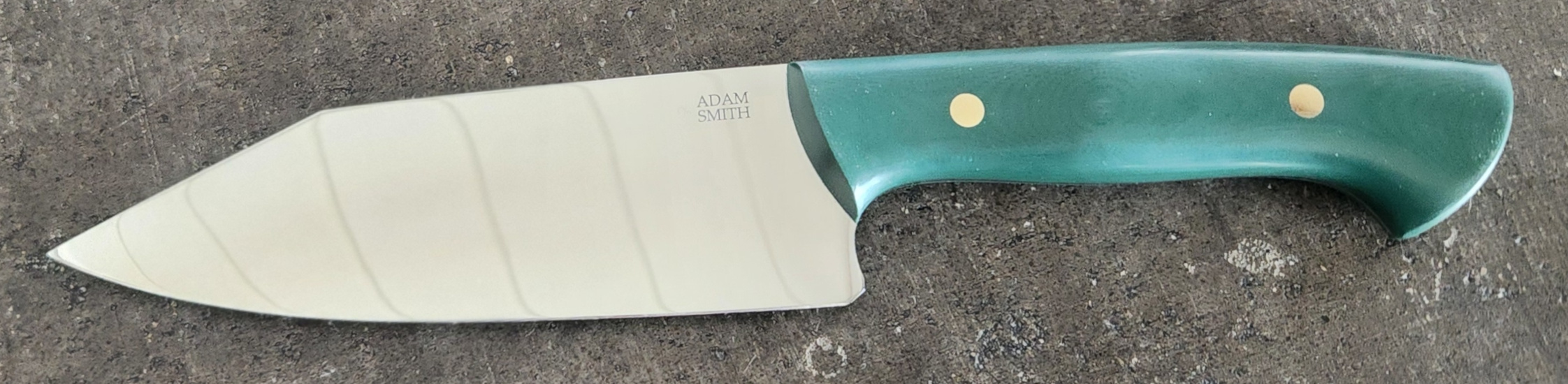 Culinary Prep knife, 14C28N steel, mirror finish, G10 handle shown, Brass bolts, 6 1/2" blade, 11" overall. Sold, model is available on order. Base price $400, extra $50 for particle metallurgy steels.